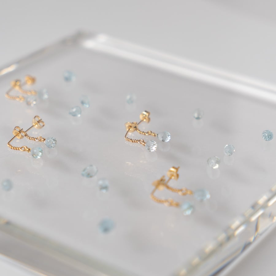 モザンビーク産AAAグレードの高品質なアクアマリンは、小ぶりながらも光を受けて優しくきらめき、耳元にさりげない上品さを添えてくれます。