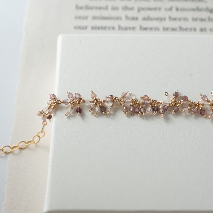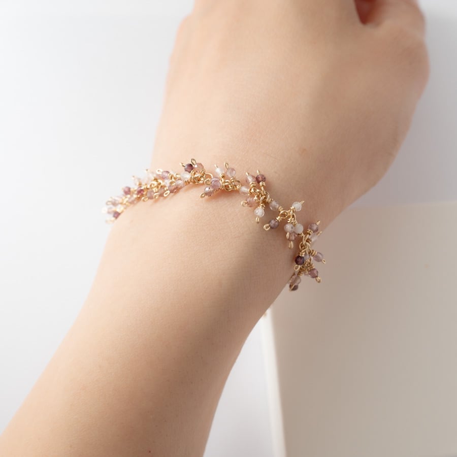 2mmほどのスピネルとローズクォーツを使用し、ふわっと広がるカスミソウのように仕立てたブレスレットです。